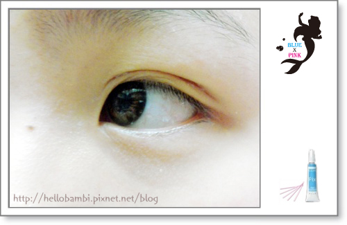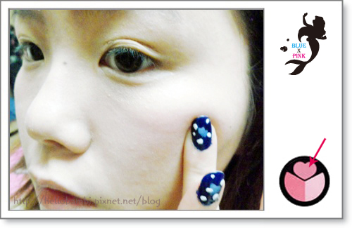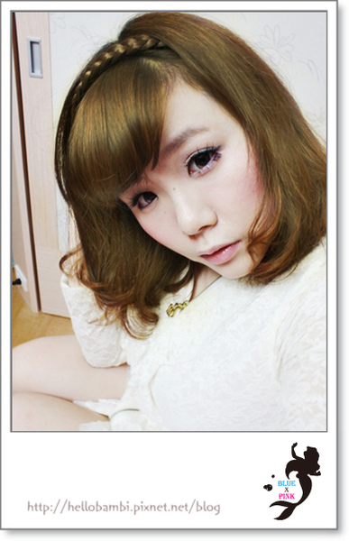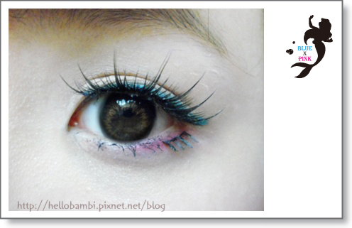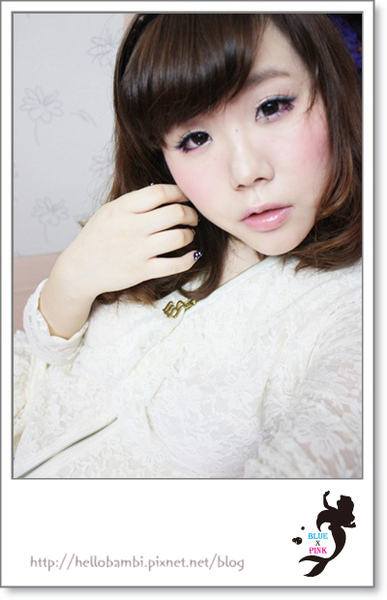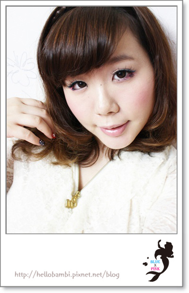 STEP.16 貼上假睫毛,上睫毛是F&W的忘了型號束狀假睫毛, 下睫毛是不知道牌子型號自己剪的醜醜假睫毛(大汗) STEP.17 終於到了最後~~就差唇妝就完成囉! 我先遮唇色再用za 亮采映色脣膏 #RS1 +透明唇蜜完妝 你以為~這樣就完成了嗎? 不不不,後來我發現,雖然雜誌步驟沒寫到, 可是人家久美子偷偷開了眼頭! 我發現POPTEEN的麻豆都很愛開眼頭耶, 雖然我開眼頭後會化身大蛇丸.......... 大蛇丸表示:........... 可是為了仿妝的完整性,我還是開了… 嗯~久美子的藍色x粉紅色大蛇丸…不不不,是美人魚妝容就完成囉! 相機有點吃色,眼妝好像沒有很顯色 為了更像一點,我還特地捲了頭髮,還畫了跟久美子一樣的指甲呢! 雖然畫的很粗糙就是了,哈哈 眼部近拍,為了貼成大外雙,眼皮看起來好髒…請忽視它吧>< 以上就是久違的妝容分享,喜歡的朋友給班比個回應吧~ 你們的支持就是我發文的動力!我們下次見囉